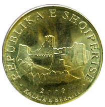 The obverse of the coin features a detailed representation of a historic Albanian fortress, identified in the design as Rozafa Castle. The fortress is shown in raised relief, with stepped walls and towers rendered in simplified but recognisable form. Encircling the image is the inscription Republika e Shqipërisë, clearly stating the issuing state, while the year of minting appears below the design. This architectural motif reinforces themes of resilience, continuity, and national heritage, making the obverse both symbolic and visually distinctive.