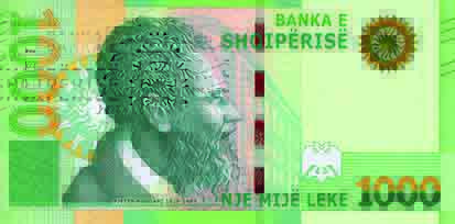 On the front of the note, the dominant feature is a finely engraved portrait of Pjetër Bogdani, a prominent 17th-century Albanian intellectual, writer, and cleric. The portrait is executed in classic intaglio style, with dense, layered line work creating depth across the face, hair, and beard. This traditional engraving contrasts with the modern colour scheme, which is led by vivid green tones with subtle transitions into lighter hues. The denomination “1000” appears prominently in multiple locations, designed for rapid recognition, while the inscription Banka e Shqipërisë is clearly printed along the upper area of the note. A vertical security window and strip run alongside the portrait, incorporating micro-text, transparent elements, and tonal shifts that change under light, reinforcing protection against counterfeiting.