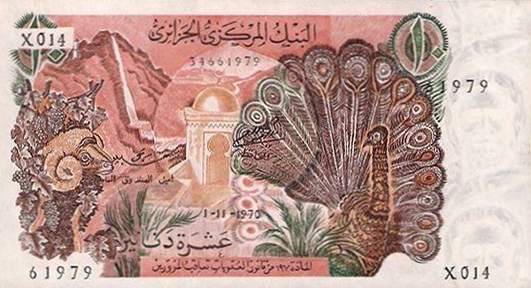 The 10 Algerian Dinars banknote issued in 1970 forms part of Algeria’s early post-independence monetary development, reflecting a growing confidence in national identity and cultural heritage. Produced by the Banque Centrale d’Algérie, this series combines wildlife, architecture, and historic symbolism within an ornate engraved framework. The design is richly detailed, characteristic of late 1960s and early 1970s banknote artistry.