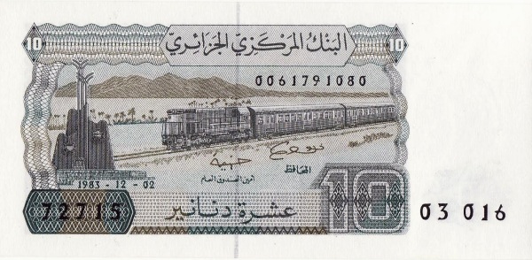 The reverse focuses on transportation infrastructure. A long train stretches across the composition, travelling through an open landscape with utility poles and industrial features visible in the distance. The imagery conveys movement, connectivity, and economic growth. The denomination “10” is clearly displayed in both Arabic and Western numerals, and the issue date appears along the lower section. The layered border patterns and tightly engraved background textures reflect the more modernised security approach of early 1980s Algerian banknotes.
