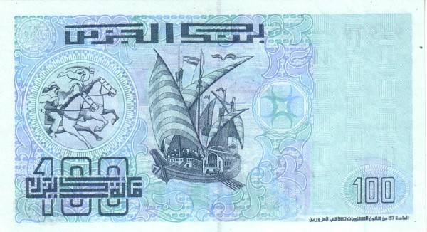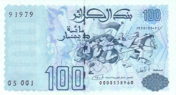 This current blue coloured 100 Algerian dinar banknote (type 1992). The obverse side shows an image of soldiers with spears and shields charging behind horseback cavalier with a sabre during the Battle of El Harrach in 1775. The reverse side shows charging Algerian horse riders and an Ancient Spanish galley in the centre of the banknote.