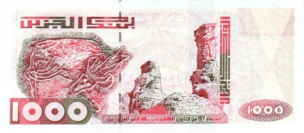 On the front of the note, the design draws heavily from Algeria’s deep historical roots. Prominent imagery includes prehistoric rock art motifs and sculptural elements referencing early North African civilisations. These are rendered in strong red and earthy tones, with engraved detailing that creates texture and depth across the composition. The denomination “1000” appears clearly in both Arabic and Western numerals, integrated into the design rather than isolated from it. Arabic script identifies the issuing authority, while a vertical security band incorporating colour-shifting and reflective elements enhances both security and visual impact.