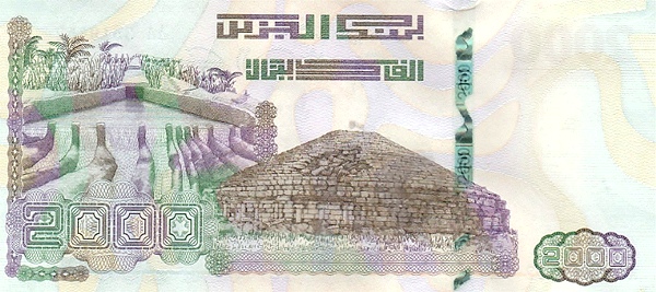 The reverse highlights Algeria’s historical and architectural heritage. A stepped stone monument occupies the centre of the composition, flanked by imagery of agricultural produce and palm groves, symbolising both resilience and economic development. The structured layout integrates geometric patterns and finely detailed linework, ensuring visual continuity with the obverse. The denomination is again prominently displayed, framed within ornamental shapes that echo traditional North African design influences.