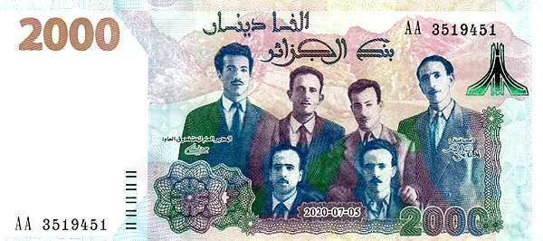 The 2000 Algerian Dinars banknote issued in 2020 is a modern high-denomination note celebrating Algeria’s national history and independence. Released by Bank of Algeria, this issue combines contemporary security technology with imagery honouring key figures and milestones from Algeria’s struggle for sovereignty. The design is vibrant and symbolically rich, reflecting both political heritage and cultural continuity.