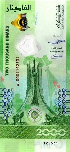 The 2000 Algerian Dinars commemorative banknote issued in 2022 is a modern celebratory issue released by Bank of Algeria to mark a significant national milestone. This high-denomination note combines contemporary design techniques with symbolic imagery reflecting Algeria’s independence, state institutions, and national resilience. The layout is clean, architectural, and security-focused, signalling a clear evolution from earlier, more illustrative Algerian issues.