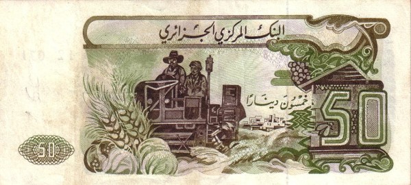 The 50 Algerian Dinars banknote issued in 1977 represents a later phase in Algeria’s post-independence monetary development. Produced by the Banque Centrale d’Algérie, this series reflects a stronger focus on agricultural productivity, industrial progress, and national self-sufficiency. Compared with the earlier 1964 issues, the 1977 design adopts a more structured graphic style, combining bold denomination numerals with detailed engraved vignettes celebrating key sectors of the Algerian economy.