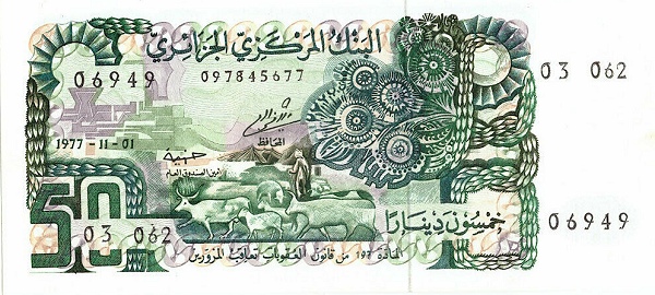 The reverse of the 50 Algerian Dinars (1977) continues the agrarian narrative, featuring livestock and rural landscapes rendered in fine engraved detail. Ornamental circular patterns and interwoven crop motifs add complexity to the design while enhancing counterfeit resistance. The denomination is repeated clearly in both Arabic and Western numerals, ensuring accessibility across linguistic contexts. The issue date, 1-11-1977, is printed along the lower section, marking its formal introduction within Algeria’s evolving banknote series.