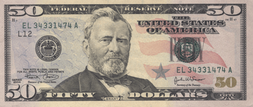 On the front side of this coloured 50 USD banknote issued by the Federal Reserve is a portrait of the 18th United States of America President, Ulysses Grant. The reverse side of the paper banknote is an image of the Capitol Hill building and the wording ‘In God We Trust’.