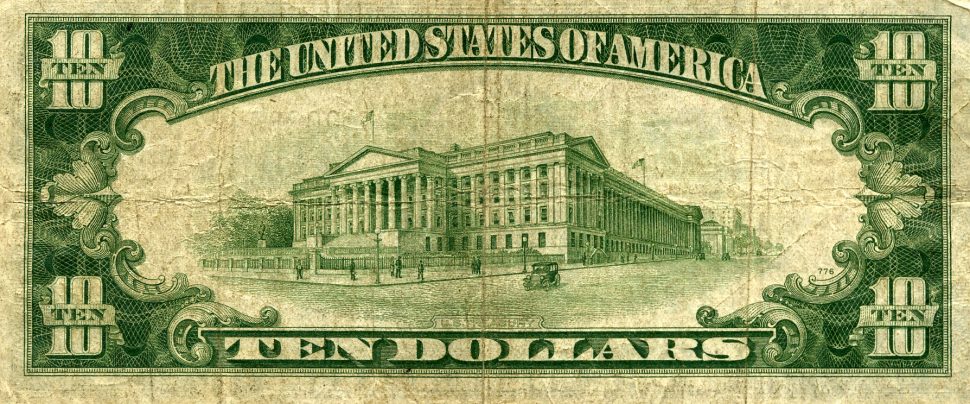 The reverse of the banknote features an engraved depiction of the US Treasury Building in Washington, D.C. This architectural image reinforces Hamilton’s legacy and his connection to the American financial system. The design is framed by ornamental borders and repeated denomination numerals, giving the note a formal and authoritative appearance.