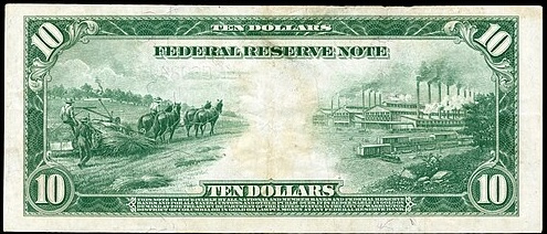 The reverse of the note features a detailed engraved scene symbolising the development of the American economy. On the left, farmers work the land using horse-drawn agricultural equipment, while the right side depicts factories, rail wagons and industrial buildings. This contrast between agriculture and industry reflects the rapid economic expansion of the United States in the early twentieth century. The denomination “Ten Dollars” appears at the centre, framed by ornate engraved borders and large corner numerals.