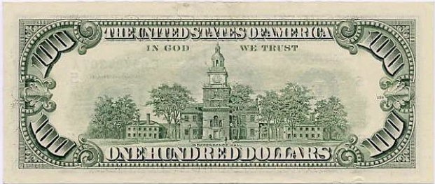 On the obverse of the banknote is an engraved portrait of Benjamin Franklin, one of the Founding Fathers of the United States. Franklin’s portrait is centred within an oval frame, surrounded by intricate guilloché patterns and ornamental borders. The wording “The United States of America” appears across the top, with the denomination “One Hundred Dollars” clearly displayed along the lower portion of the note.