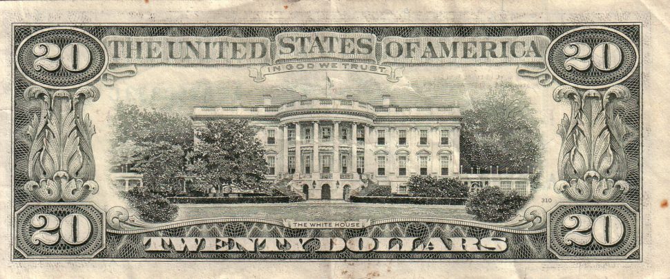 The reverse of the banknote features a detailed engraved image of the White House in Washington, D.C., the official residence of the President of the United States. This architectural vignette is framed by ornate borders and repeated denomination numerals, reinforcing the authority and national symbolism associated with the $20 denomination.