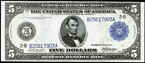 US 5 Dollar Banknote (Blue Seal) First Issued 1914