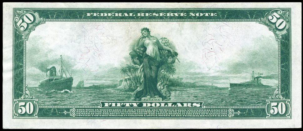 The reverse of the note features a dramatic allegorical maritime scene dominated by a standing female figure symbolising America and global commerce. She is positioned between two ocean-going steamships, representing international trade and the United States’ growing influence on the world stage. Palm trees, open water and distant vessels complete the composition, while the denomination “Fifty Dollars” is displayed prominently at the bottom, framed by elaborate decorative borders and corner numerals.
