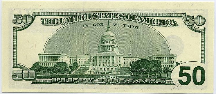 The 2001 series $50 note is printed primarily in black and green ink on light-coloured paper and reflects the traditional appearance of US currency prior to the introduction of colour-shifting inks and advanced anti-counterfeiting technology. While it remains legal tender in the United States, this design is no longer produced and is increasingly regarded as a withdrawn or legacy series outside the US banking system.
