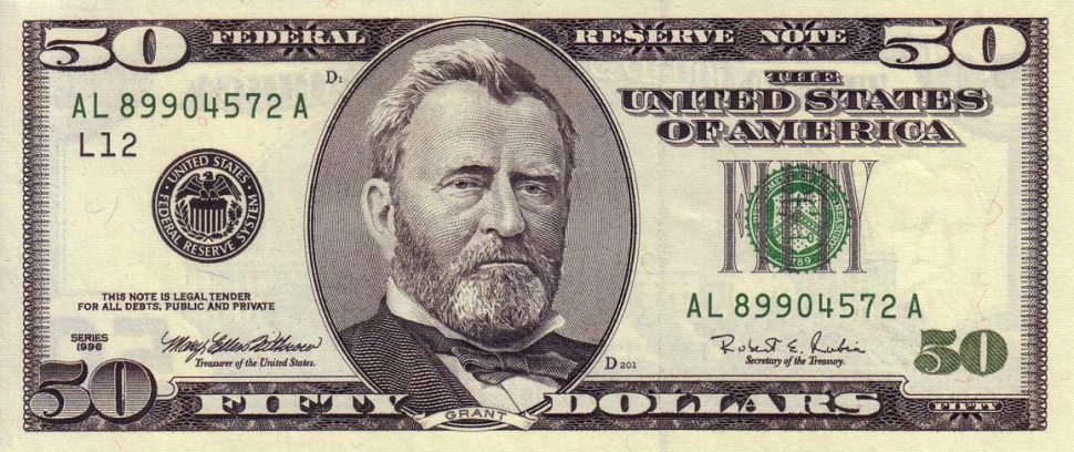United States dollar banknotes have been issued in a variety of designs and series by the Federal Reserve, including this US $50 banknote featuring Ulysses S Grant, issued in 2001. This note forms part of the pre-2004 large-portrait design era and was widely used in both domestic and international circulation before enhanced security features were introduced on later US banknotes.