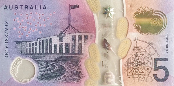 Australian Dollar banknotes were issued in 6 different denominations by The Reserve Bank of Australia, including this current 5 Australian dollar banknote series 2016. This 5 Australian dollar banknote is part of the current series of Australian dollar banknotes. These 5-dollar Australian banknotes were first issued by the Reserve Bank of Australia in 2016 and are currently still in circulation.