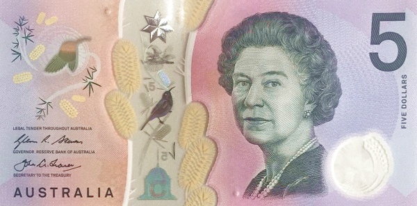 These new $5 AUD banknotes are polymer and have a top to bottom window. Portrayed on the note is an image of a Eastern Spinebill bird, a type of honeyeater and yellow coloured prickly moses which is an Australian wattle. This five-dollar Australian dollar banknote also has an image of Queen Elizabet II, the head of the Commonwealth. These issued Australian $5 dollar banknotes were the first to feature a ‘tactile’ element designed to help vision impaired people tell the difference between banknotes.
