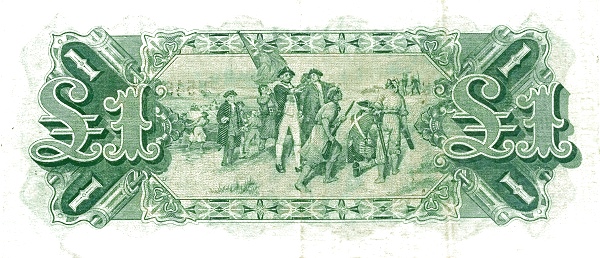On the back, the design becomes more narrative while remaining tightly controlled by engraving and border structure. Large £1 devices dominate the left and right, rendered in bold, shaded lettering that anchors the composition. Between them is a rectangular vignette showing a colonial-era working scene: figures gathered in an outdoor setting, with equipment and livestock-like forms suggested in the background, presented in fine line engraving with a muted, documentary feel. The entire scene is enclosed within a complex border of interlaced patterns and corner flourishes, giving the reverse the same “banknote-as-security-engraving” character as the front.