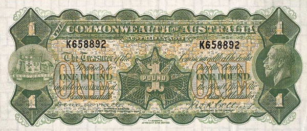 The 1 Australian Pound banknote from the 1923–1927 series is a classic pre-decimal Commonwealth issue, printed in a traditional engraved style that prioritises intricate linework, formal typography, and layered security patterning. This is a firmly “interwar” design language: dense guilloché backgrounds, prominent serial numbering, and carefully framed national symbolism intended to convey stability and authority in everyday circulation.