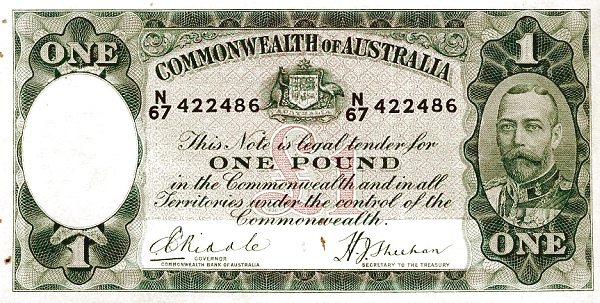 On the front of the banknote appears a portrait of King George V at the right-hand side, framed within an ornate oval cartouche. The inscription Commonwealth of Australia arches across the upper centre, with the legal tender promise printed prominently in flowing script beneath. The denomination “ONE POUND” is repeated across the design within decorative panels, while serial numbers appear on either side of the central text. A large blank watermark panel occupies the left portion of the note, serving as the principal anti-counterfeit feature. The surrounding borders are filled with intricate line engraving and repeating geometric motifs typical of the era’s security printing techniques.