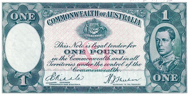The 1 Australian Pound banknote issued in 1936 forms part of Australia’s interwar pre-decimal currency system, printed by the Commonwealth Bank of Australia. This issue represents a refined variation within the King George V series, retaining the formal engraved style typical of early 20th-century Commonwealth banknotes. The design emphasises clarity, authority, and security through balanced layout, fine line engraving, and restrained colour.