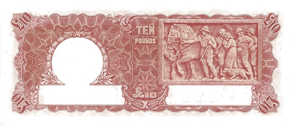 The reverse presents a dramatic pastoral and labour scene, showing figures handling livestock in a structured agricultural setting. The composition symbolises Australia’s rural economy and productivity during the period. The figures and animals are rendered in carefully layered engraved shading, framed by a patterned border that mirrors the complexity of the front design. The dominant red colour scheme distinguishes the note within the pre-decimal series and reinforces its high denomination status.