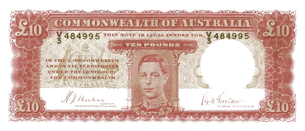 The 10 Australian Pounds banknote issued between 1938 and 1952 belongs to Australia’s pre-decimal currency system, used prior to the introduction of the Australian dollar in 1966. Produced by the Commonwealth Bank of Australia, this higher-denomination note reflects a period spanning the late interwar years, the Second World War, and the early post-war era. Its detailed engraving and rich colour palette represent the authoritative visual style typical of British Commonwealth banknotes of the mid-20th century.