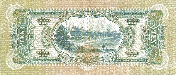 The reverse features a finely engraved central vignette of a large dam structure with water flowing across the spillway, framed within an ornate oval panel. Surrounding scrollwork and repeating border motifs emphasise symmetry and balance. The denomination is repeated in multiple positions, including “Ten Shillings” and numeric devices at each end, reinforcing clarity and anti-forgery design. The green and blue tonal layering enhances engraving depth and texture.