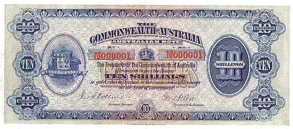 The 10 Australian Shillings banknote issued between 1913 and 1924 forms part of Australia’s early “Australian Note” series introduced after Federation. Equal to half a pound and often referred to as a Half Sovereign in paper form, this denomination circulated widely during the First World War era and into the early 1920s. The design reflects the Commonwealth’s assertion of national authority over currency, replacing earlier private and colonial bank issues with federally guaranteed notes.