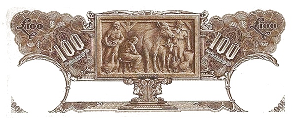 The reverse presents an engraved allegorical agricultural scene centred on livestock handling and rural activity. Figures working alongside animals are depicted within a raised panel, surrounded by symmetrical ornamental framing. Large 100 pounds inscriptions appear on either side, integrated into curved decorative supports. The monochrome engraving emphasises line precision and depth rather than colour contrast, a hallmark of high-value banknote printing of the era.