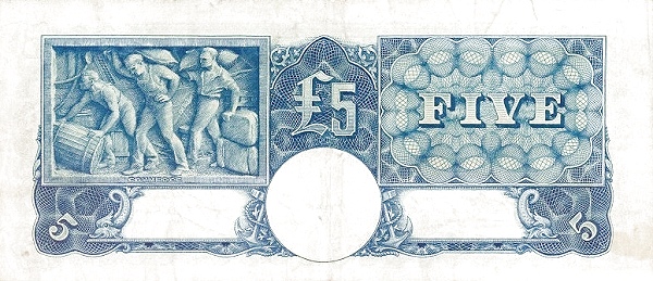 The reverse features an industrial labour scene showing workers moving cargo barrels and materials, symbolising trade and economic productivity. The vignette is rendered in precise engraved linework and framed within geometric panels. The denomination “£5” appears centrally above a patterned panel containing the word FIVE, while the remainder of the design is enclosed by repeating border patterns that mirror the structure of the front.