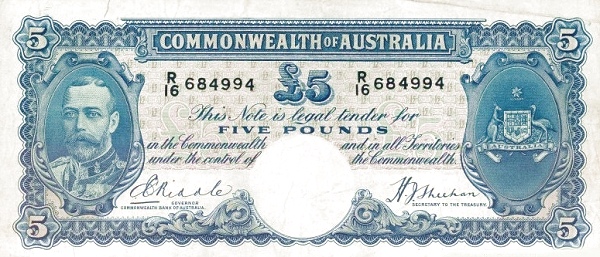 The 5 Australian Pounds banknote issued between 1933 and 1939 forms part of Australia’s interwar pre-decimal currency system produced by the Commonwealth Bank of Australia. This series reflects a mature development of earlier Commonwealth designs, retaining traditional engraving techniques while refining clarity and symmetry. The note combines formal portraiture, heraldic symbolism, and labour-themed imagery within a detailed monochrome framework typical of British Commonwealth banknotes of the era.