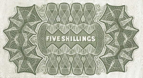 The reverse is dominated by a complex geometric security pattern with the words Five Shillings set boldly at the centre. The intricate symmetrical engraving features repeating line work, scroll motifs, and layered textures that give the note both visual depth and practical anti-forgery protection. The green monochrome palette enhances clarity and emphasises the precision of early twentieth-century printing techniques.