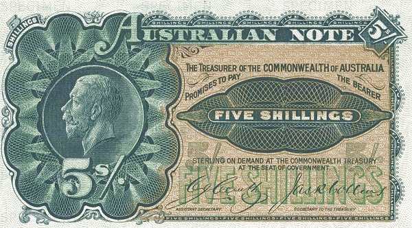 The 5 Australian Shillings banknote issued between 1913 and 1924 forms part of Australia’s earliest Commonwealth “Australian Note” series following Federation. This denomination, equivalent to a quarter of a pound, was widely used in everyday transactions during the First World War period and the early 1920s. Printed with advanced security engraving for its time, the note reflects the newly unified national identity of Australia and the shift away from colonial-era banking systems.