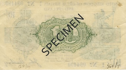 On the reverse of the note is a pale green ornamental design dominated by a central cartouche containing the value “TEN SHILLINGS”. This is surrounded by delicate scrollwork and fine line engraving. The background includes faint repeating security text and watermark-style printing, with the reverse remaining largely uncluttered, reflecting the simplified but secure style adopted for wartime Treasury currency.