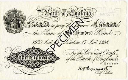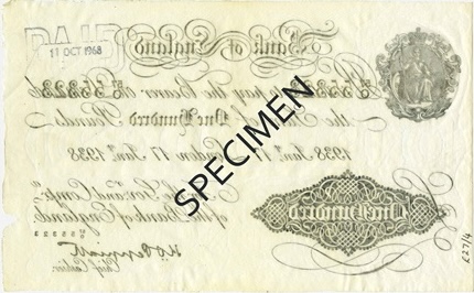 This £100 paper banknote is printed in black ink on cream paper and is printed on one side only, with the reverse left blank. Due to the extreme rarity and long circulation life of this denomination, surviving examples are often partial or incomplete, and the images shown reflect the condition in which such notes are most commonly preserved.