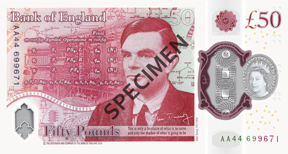 On the reverse of the note is a portrait of Alan Turing, the mathematician and codebreaker, based on a photograph from the National Portrait Gallery. Behind the portrait are technical diagrams and code-breaking references associated with the Enigma and Bombe machines. To the left appears a gold foil image of a cyclist representing Turing’s interest in cycling, along with a depiction of a Turing machine tape and binary code. Beneath the portrait is the quotation “This is only a foretaste of what is to come, and only the shadow of what is going to be.” The design also includes a large transparent window with intricate security patterns and repeated micro-text of the value “50”.