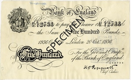 This £500 paper banknote is printed in black ink on cream paper and is printed on one side only, with the reverse left blank. Owing to the extreme rarity and long circulation life of this denomination, surviving examples are frequently partial or incomplete, and the images shown reflect the condition in which such notes are most commonly preserved.