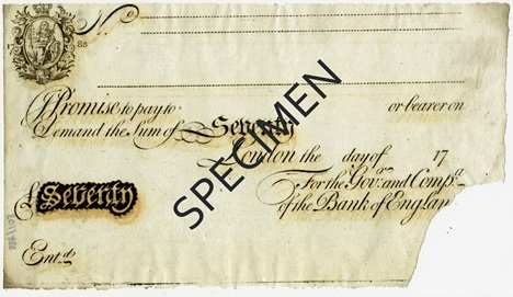 The denomination “Seventy” is displayed within an engraved ornamental scroll panel toward the lower left of the note. A handwritten serial number appears near the upper portion, while the place and date of issue are shown as London, with the date partially visible due to the incomplete condition of the surviving example. Handwritten cashier signatures and additional manuscript annotations appear in the lower section, confirming authorisation and value.
