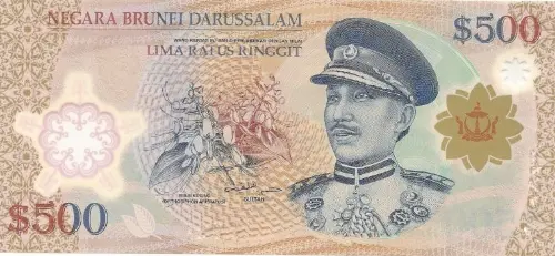 This 500 BND banknote series 2006 on the front has an image of Sultan Hassan al-Bolkiah I at right and java tea flowers at the centre. On the back is an image of the Bolkiah Mosque.