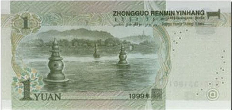 The reverse of the banknote shows a scenic landscape design, commonly associated with Chinese cultural heritage and natural beauty. The image depicts a tranquil water scene with traditional stone pagodas rising from the surface, symbolising harmony and longevity. This style of imagery is typical of Chinese currency design and contrasts with the formal political portrait on the front.