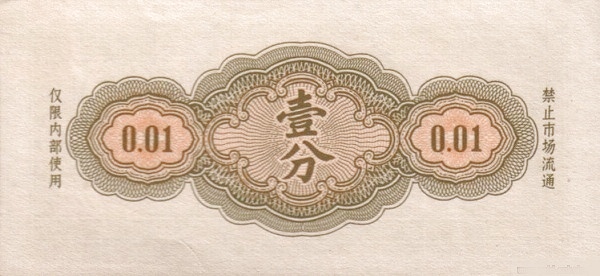 The obverse of the 1 Fen note features ornate decorative framing with the denomination clearly displayed in Chinese characters, along with numerical “0.01” markings. The design is symmetrical and formal, reflecting the official nature of the certificate. Fine line engraving and muted colour tones were used to discourage counterfeiting while maintaining consistency across the military series.