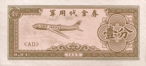 On the reverse, the banknote depicts an aircraft in flight, symbolising military logistics, mobility, and modernisation during the mid-20th century. The imagery aligns with the broader themes seen across Chinese military-issued notes of the era, which often highlighted industry, transport, and national capability. Additional text confirms the note’s military-only usage and the year of issue, 1965.