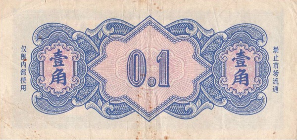 The design is dominated by intricate guilloché patterns and fine line engraving in blue tones, intended to make the note difficult to copy while remaining easy to recognise. The obverse features large denomination markings (“0.1” and the Chinese character for jiao), framed by ornate borders, with additional wording that indicates it was not for open market circulation. These restrictions are a key reason why many banks and exchange services will not accept military certificates, even when they are genuine.