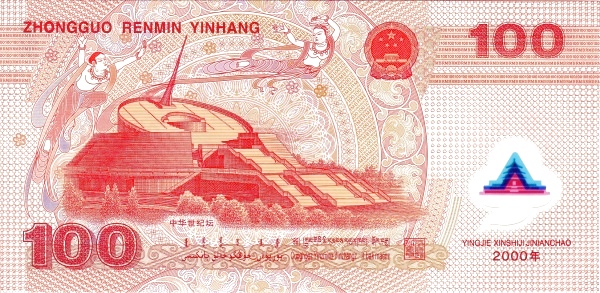 On the obverse, the banknote features powerful imagery associated with China’s future and national progress at the turn of the millennium. Architectural elements and dynamic decorative patterns reflect modernisation and continuity, while the denomination “100” is prominently displayed. Advanced printing techniques, layered line work, and fine detailing give the note a distinctive appearance compared with regular Renminbi issues of the period.