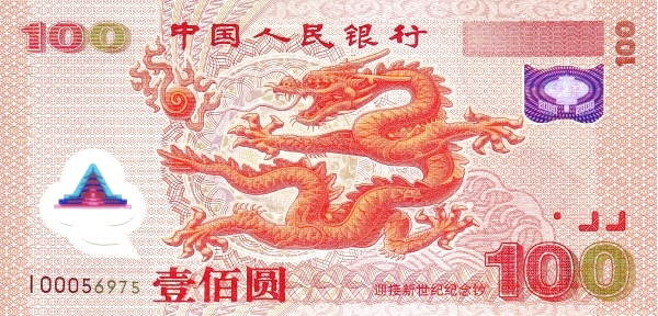 The reverse is dominated by a dramatic depiction of a traditional Chinese dragon, a long-standing symbol of strength, prosperity, and good fortune. The dragon imagery is closely associated with renewal and transformation, making it especially appropriate for a millennium issue. Additional decorative motifs and commemorative emblems reinforce the celebratory nature of the note and clearly distinguish it from everyday circulation banknotes.