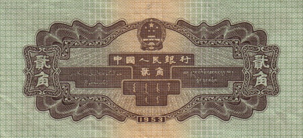 This 2 Jiao note is printed primarily in muted green and brown tones on traditional paper stock and features multilingual text, including Chinese characters and minority scripts, reflecting China’s diverse population. Banknotes from the 1953 series are now withdrawn from circulation and no longer accepted for everyday use within China.