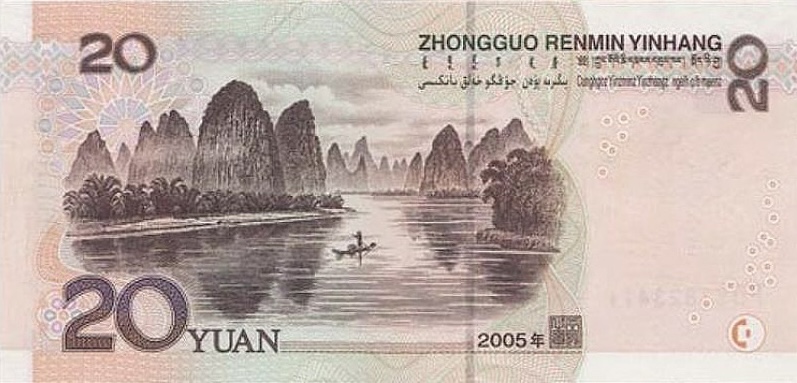 The reverse of the 20 Yuan banknote features a scenic landscape depicting the Li River in Guilin, an area famous for its dramatic karst mountains and tranquil waterways. This image highlights China’s natural beauty and cultural heritage and is rendered in fine engraved detail, with layered depth and intricate line work that enhances both visual appeal and security.