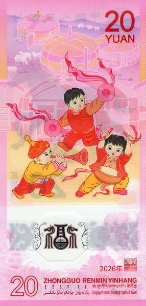 On the obverse, the note depicts lively children celebrating the Lunar New Year, symbolising renewal, prosperity, and good fortune. The denomination “20 Yuan” is clearly displayed, along with decorative motifs associated with festival traditions. The design is intended to evoke joy and optimism, aligning with the celebratory nature of zodiac-themed issues.
